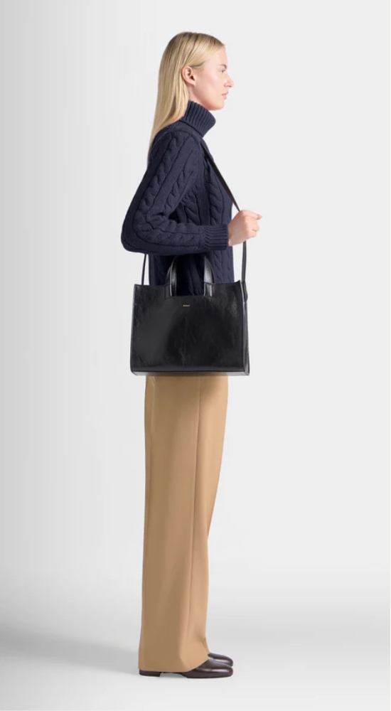 黑色、裂纹牛皮、正面烫印 Bally 标志、磁扣式开合、双提把设计、可手提/肩背/斜背多种背法。