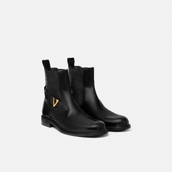 此款切尔西踝靴采用亮面小牛皮精心打造,饰有独特的V字配件,并刻有珐琅Versace Logo。
