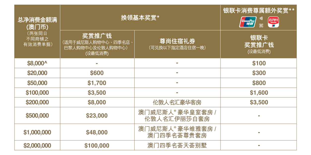 现凡于威尼斯人购物中心、四季名店、巴黎人购物中心及伦敦人购物中心购物满澳门币20,000元或以上,即可获赠价值高达澳门币100,000元之奖赏推广钱,使用银联卡签账消费满8,000元或以上更享高达澳门币3,500元之额外奖赏推广钱,可于超过500家参与商铺及专柜使用。