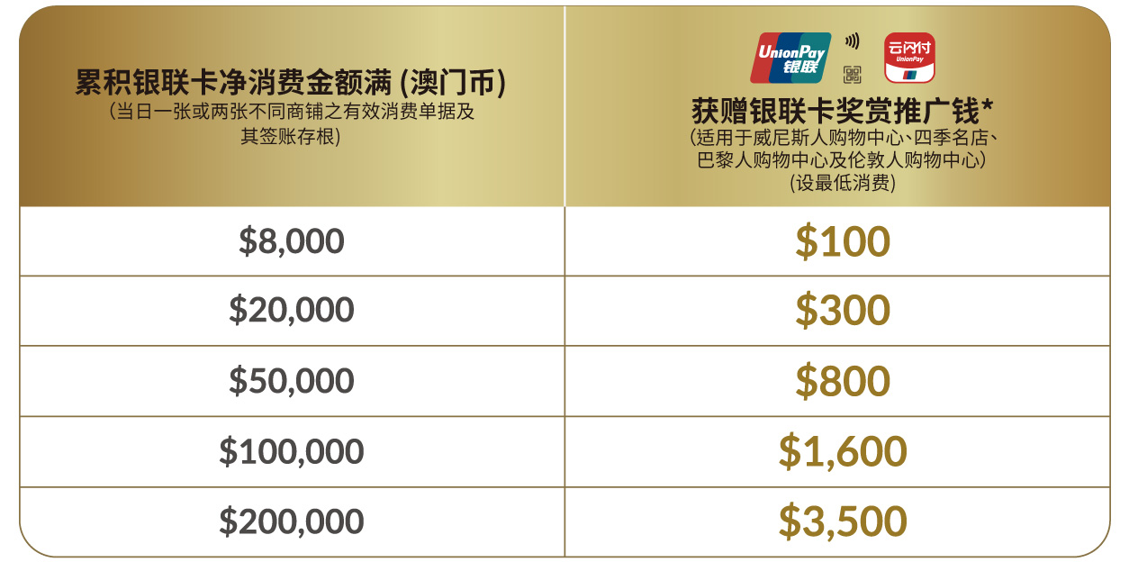 现凡于2025年10月10日至2025年12月28日(逢周五、六、日)于威尼斯人购物中心、四季名店、巴黎人购物中心及伦敦人购物中心以银联消费簽账满澳门币8,000元或以上,即可获赠价值高达澳门币3,500元之银联卡奖赏推广钱,可于超过500家参与商铺及专柜使用。