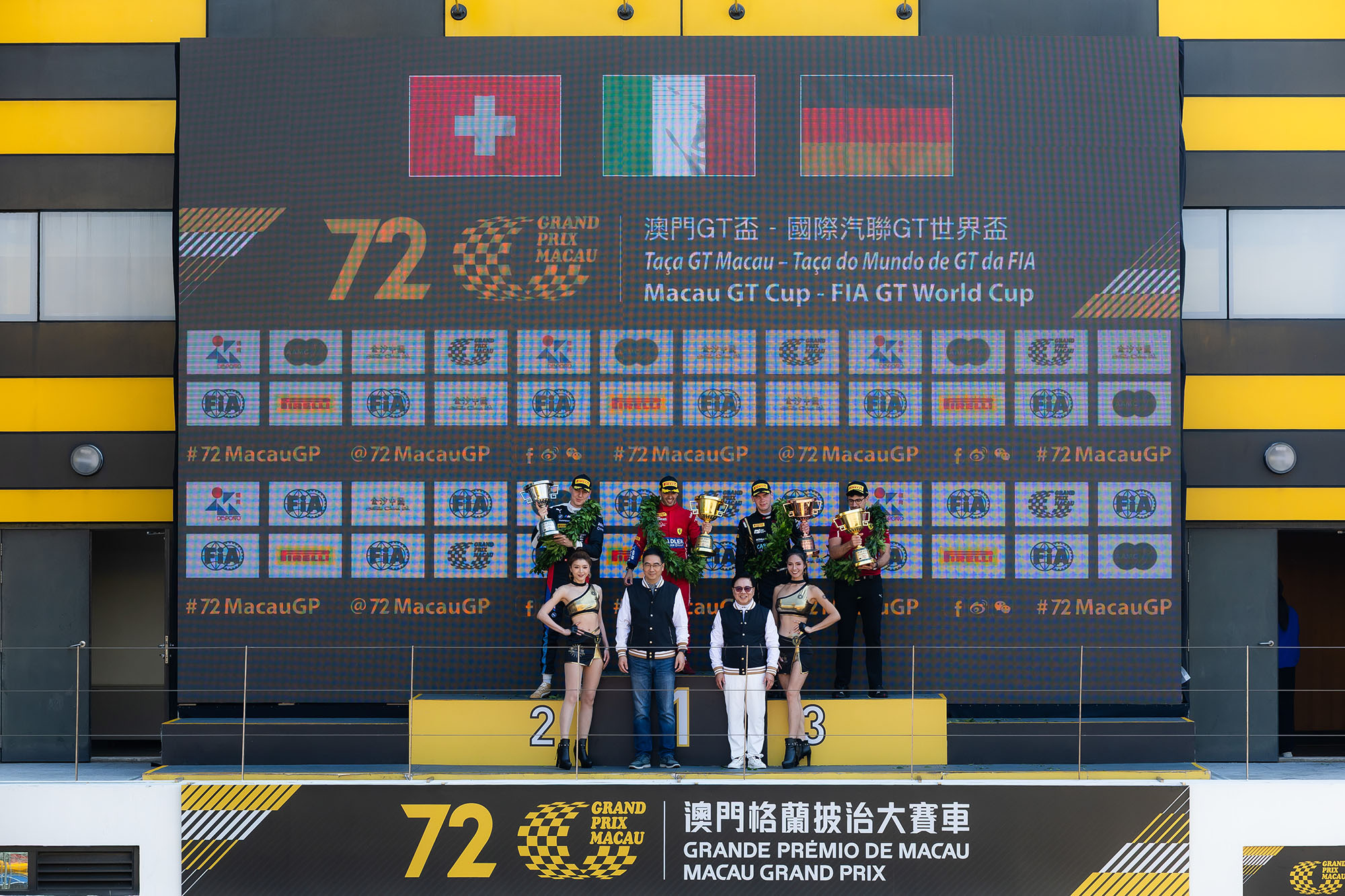 图片说明:澳门GT盃–国际汽联GT世界盃优胜车手于11月16日在颁奖台获金沙中国有限公司行政副主席王英伟博士(右中)及金沙中国有限公司行政副总裁兼财务总裁、威尼斯人澳门股份有限公司常务董事孙敏其(左中)颁发奖盃。