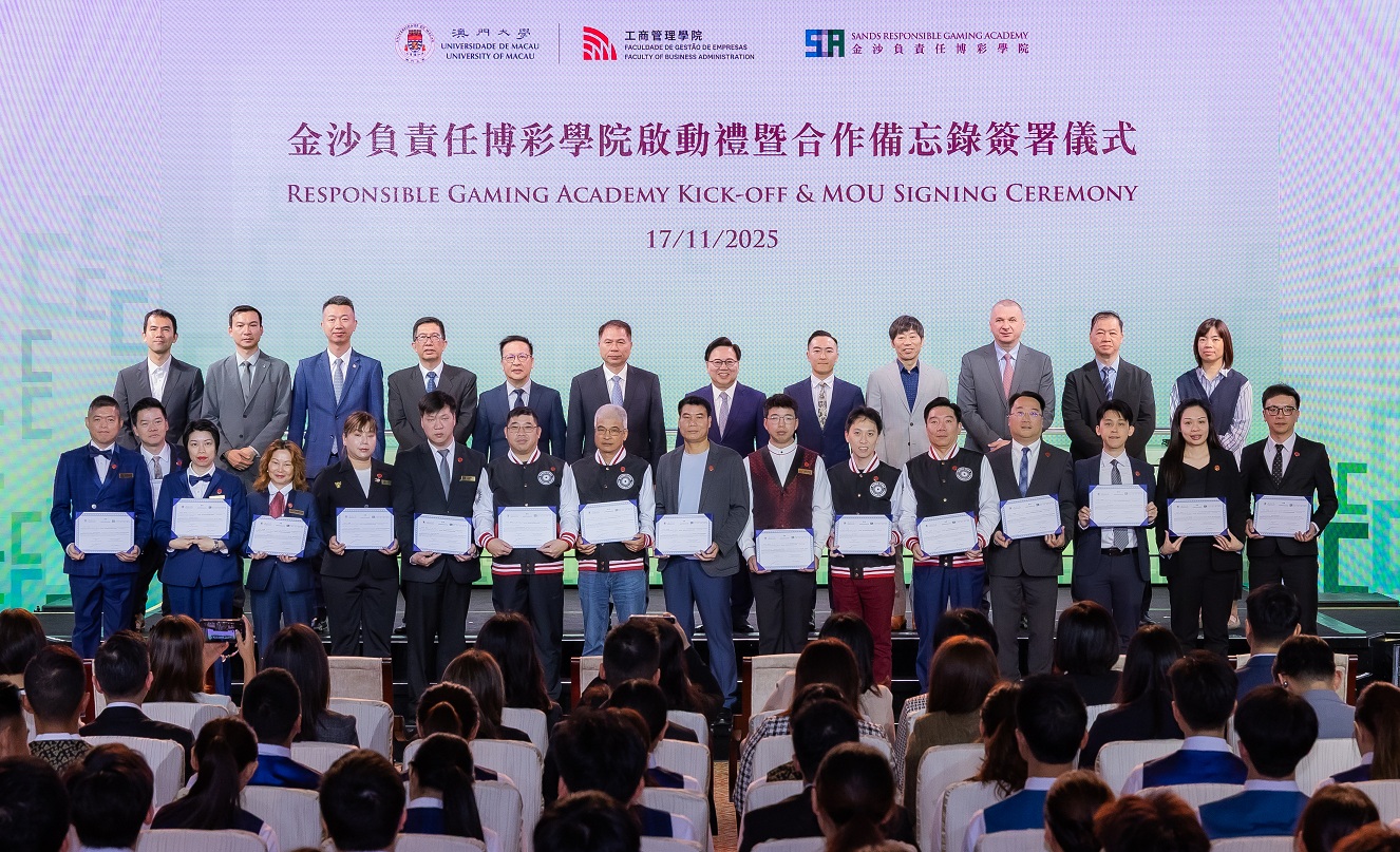 (澳门,2025年11月17日) – 金沙中国有限公司周一在澳门伦敦人为金沙负责任博彩学院举行启动礼,并与澳门大学签署负责任博彩合作备忘录,同场亦向修毕了由金沙中国与澳门大学博彩研究所携手设计的“RG360 - 澳门负责任博彩专业大使课程”的学员颁发证书,标志著双方在负责任博彩领域的产学研合作迈向新里程。