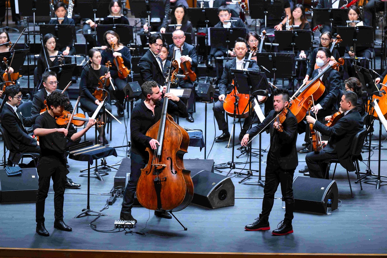 图片说明: 金沙中国冠名赞助的《星光・交响乐》音乐会于11月30日在澳门文化中心综合剧院上演,由澳门乐团音乐总监兼首席指挥廖国敏担任指挥。演出当晚,Time for Three与澳门乐团一同演绎古典、美国乡土以至流行音乐曲目,三人以乐器演奏结合人声演唱,带来别开生面的精彩表演,让观众倍感惊喜。
