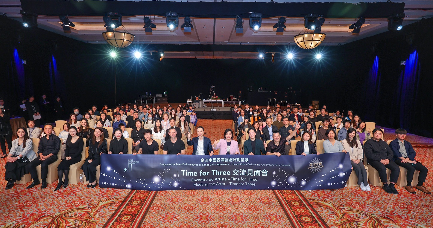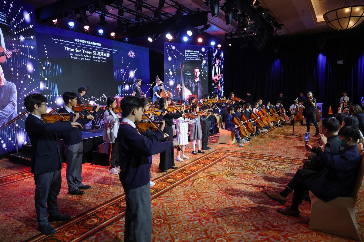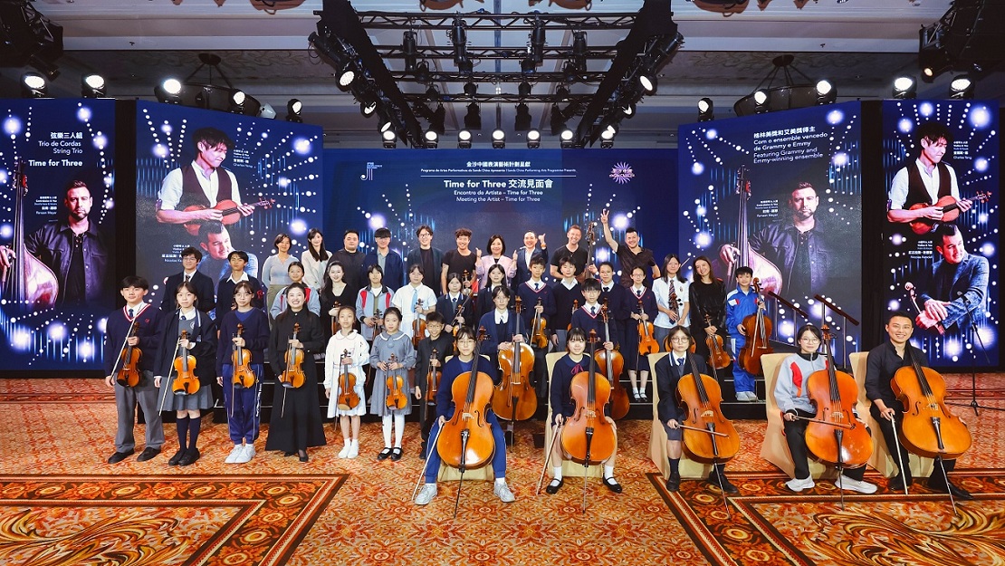 (澳门,2025年12月2日) – 澳门文化局、金沙中国有限公司及澳门乐团携手于11月30日邀请荣获格林美奖及艾美奖的美国弦乐三人组合Time for Three来澳举行《星光・交响乐》音乐会,并于12月1日的交流见面会上与本澳年轻学生们并肩演奏。上述活动为“金沙中国表演艺术计划”之最新项目。