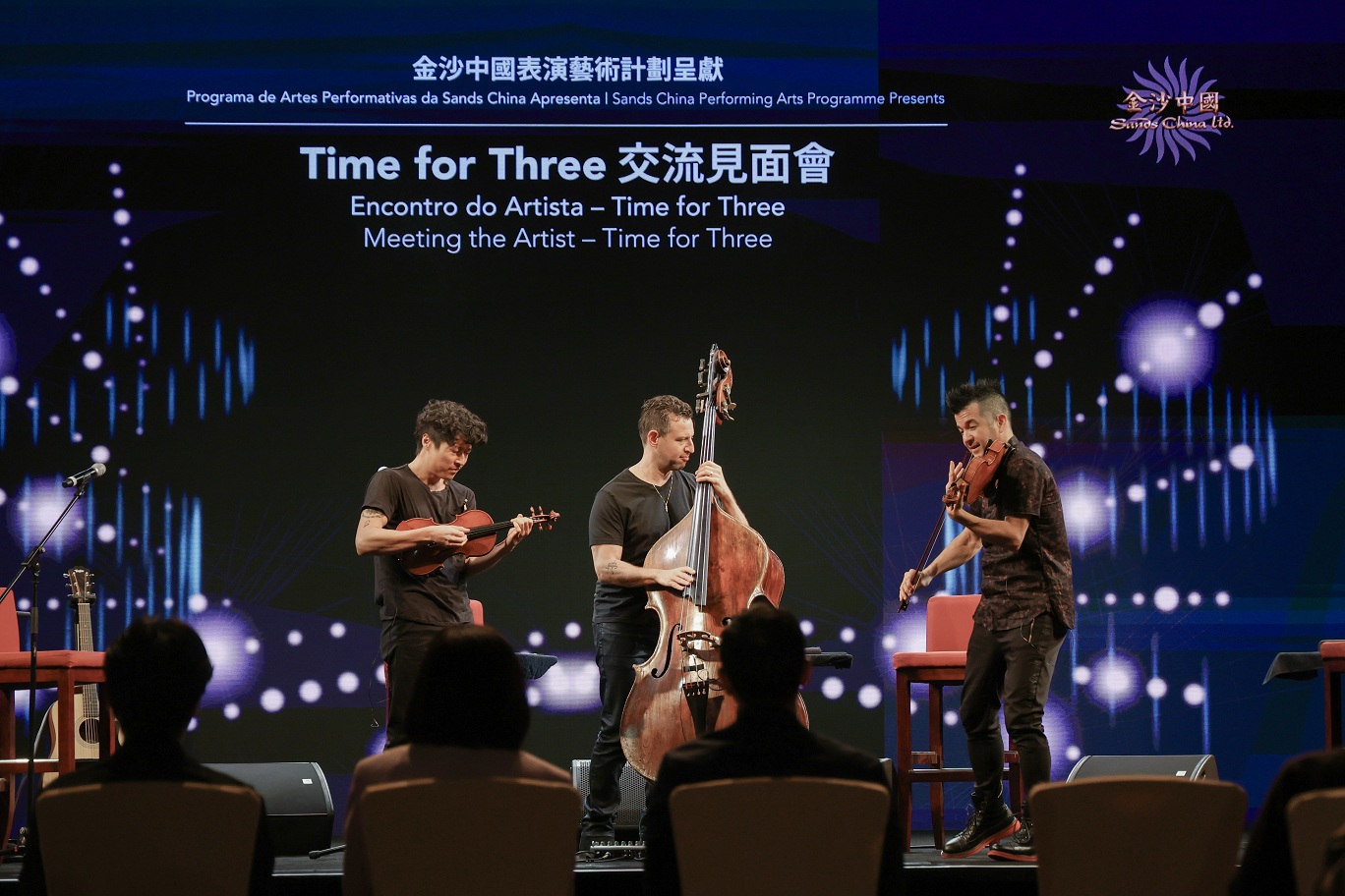于11月30日在澳门文化中心综合剧院上演的《星光・交响乐》音乐会由金沙中国冠名赞助,并由澳门乐团音乐总监兼首席指挥廖国敏担任指挥。演出当晚,Time for Three与澳门乐团一同演绎古典、美国乡土以至流行音乐曲目,三人以乐器演奏结合人声演唱,带来别开生面的精彩表演,让观众倍感惊喜。